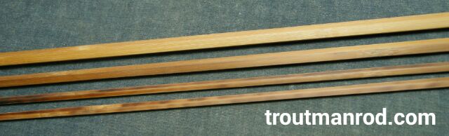 手前からバット、3番、2番、ティップです。2番の途中までダブルビルドでティップはダブルではありません。表面の竹の厚さはバット(1mm)から2番(0.6mm)と徐々に薄くなっています。