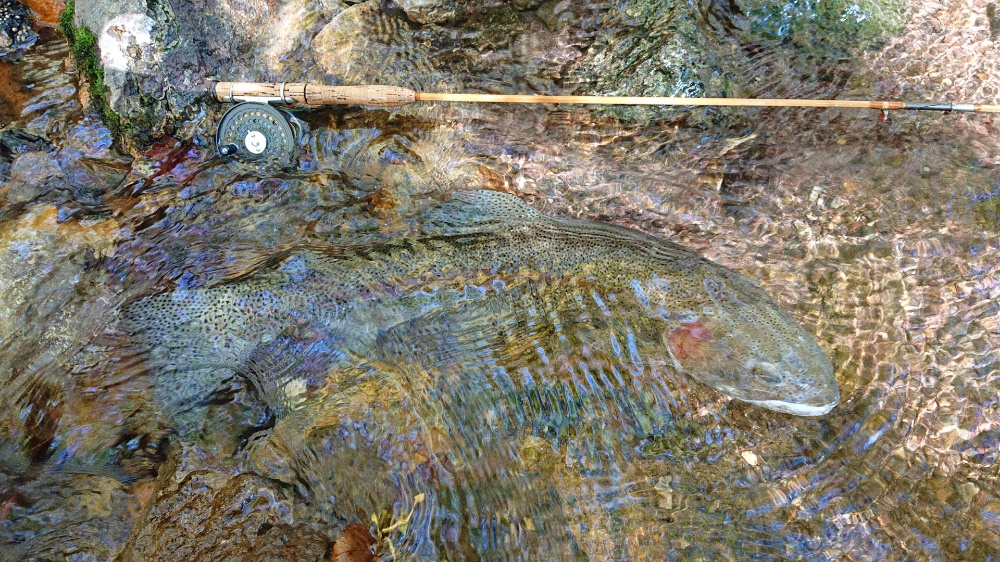 早い流れの奥フラットウォーターを悠々とライズしながら回遊してるレインボーキャッチしました。